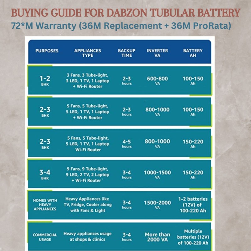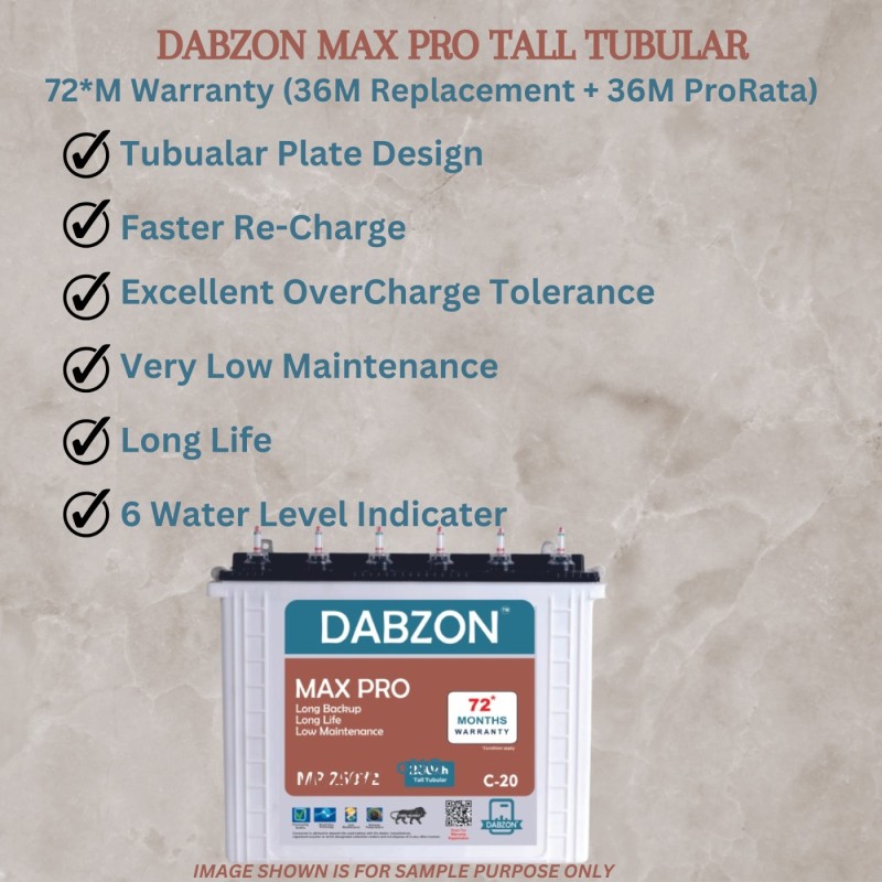 • Dabzon launched Tubular types batteries (Tall Tubular and Short Tubular) under 72 Months and 48 Months warranty, engineered with cutting-edge technology to provide you with reliable power backup. With an advanced tubular design.