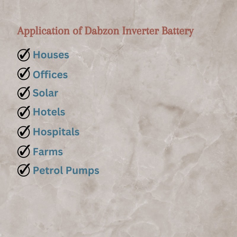 • Dabzon inverter batteries are compatible with all inverter brands and ensure uninterrupted power for a wide range of applications.